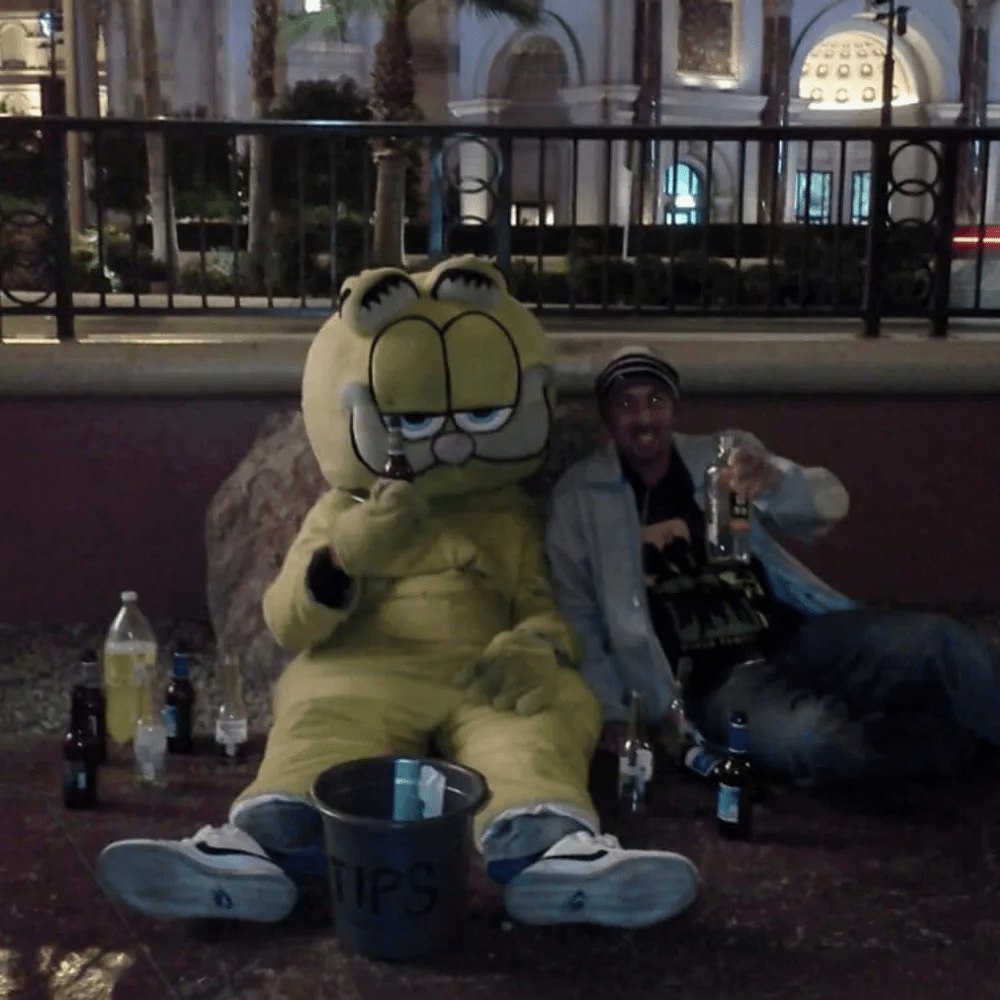 People who work in Vegas aren’t all work and no play. This hardworking fellow wearing a Garfield suit is proof – he’s just here to have some fun and soak up the city’s chill vibes. He’d had enough of walking around and chatting to folks (or taking selfies with them), so decided it was time to chill. It looks like he found another person to share the experience with, a plethora of adult beverages at his disposal. Just the two of them and their drinks – bliss!